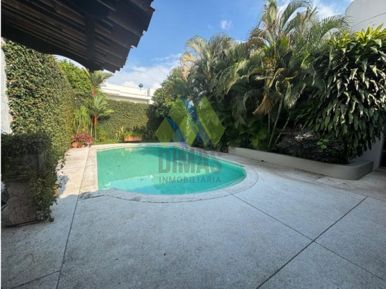 Primer piso: amplio antejardín, dos parqueaderos paralelos, tres salas independientes (dos con acceso a jardines internos y piscina), comedor con mueble empotrado, cocina semiabierta, baño social con turco, depósito, dos salas adicionales junto a la piscina, zona de TV, BBQ, piscina grande y cuarto de servicio con baño.
